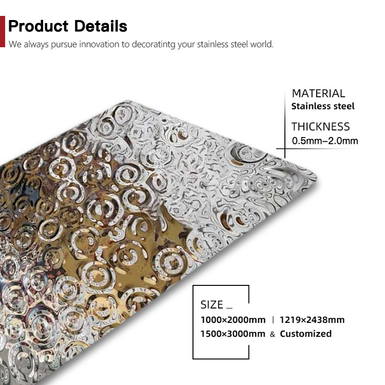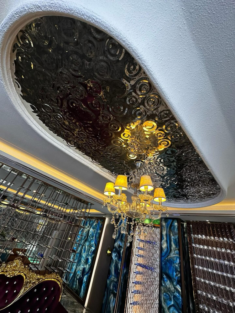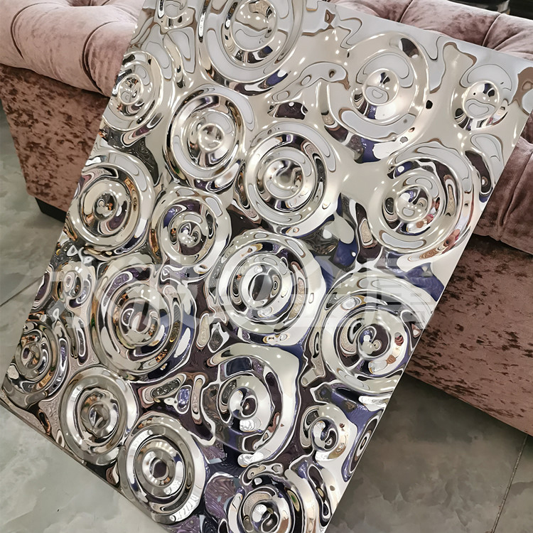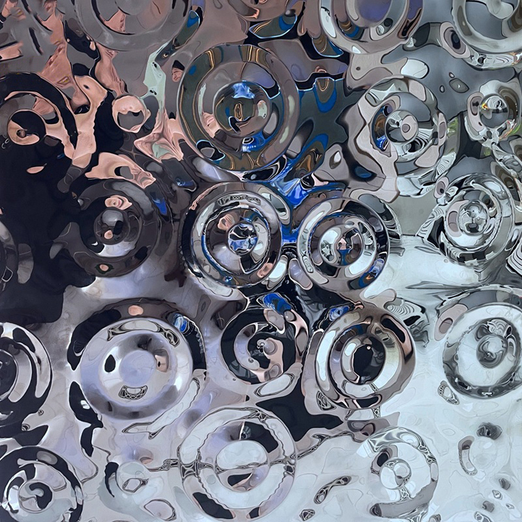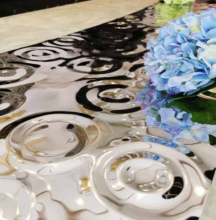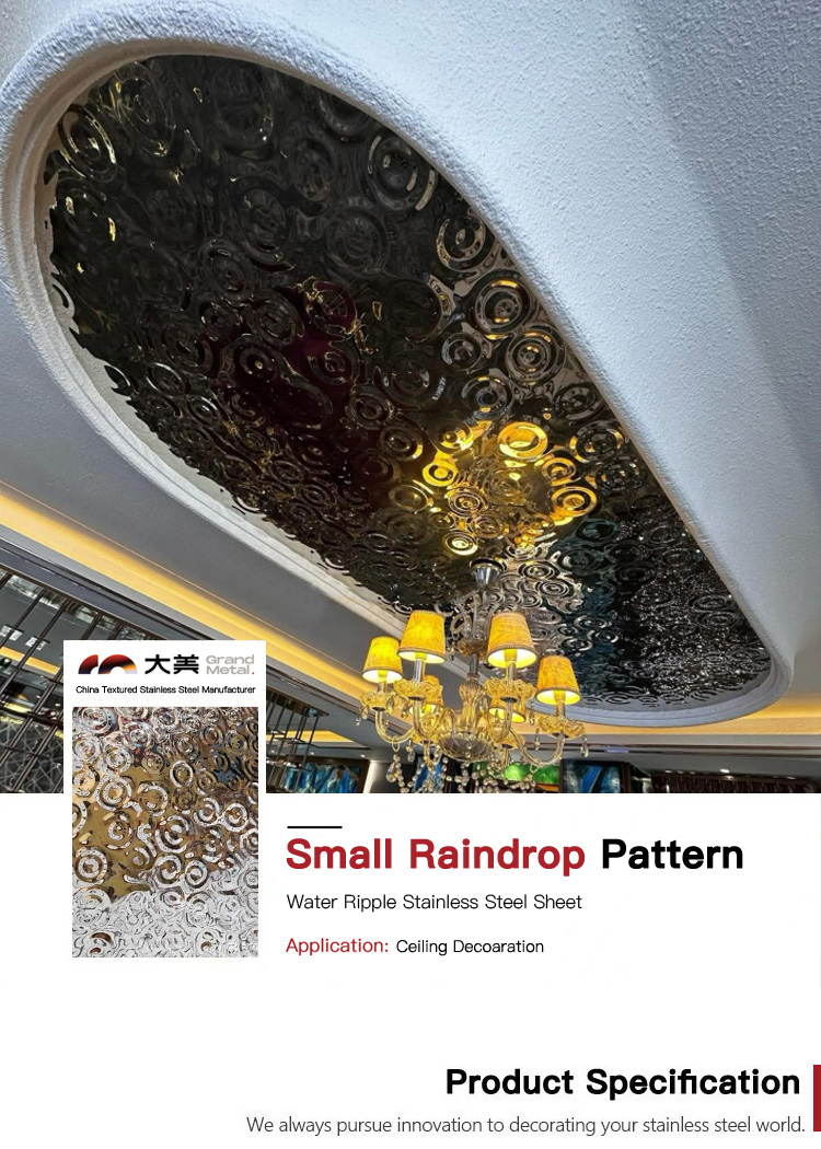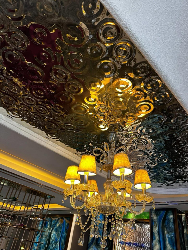 This is a mirror-polished finish stainless steel sheet for the ceiling with a small raindrop ripple pattern. Its design is inspired by the irregular ripples formed when raindrops fall onto a water surface during rainfall. It uses the raindrop pattern to decorate the wall and utilizes the 3D light and shadow effects created by its mirrored surface to showcase the dynamism and depth of the ceiling, giving each ceiling a unique charm. It is an ideal ceiling decoration material.