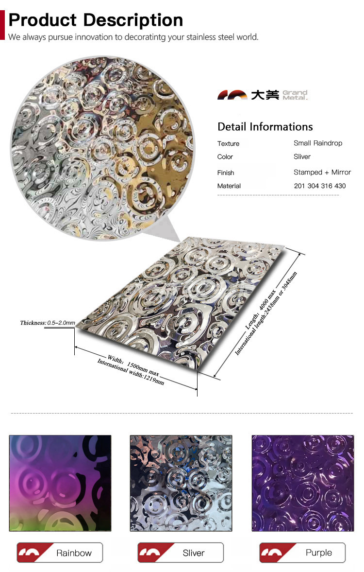 Grand Metal offers a variety of raindrop ripple pattern stainless steel sheets with different designs. All products are beautiful, practical, and durable, suitable for various applications such as walls and ceilings. We also provide one-stop stainless steel sheet for wall installation guidance services. If you are interested in our raindorp ripple stainless steel sheets, please feel free to contact us!