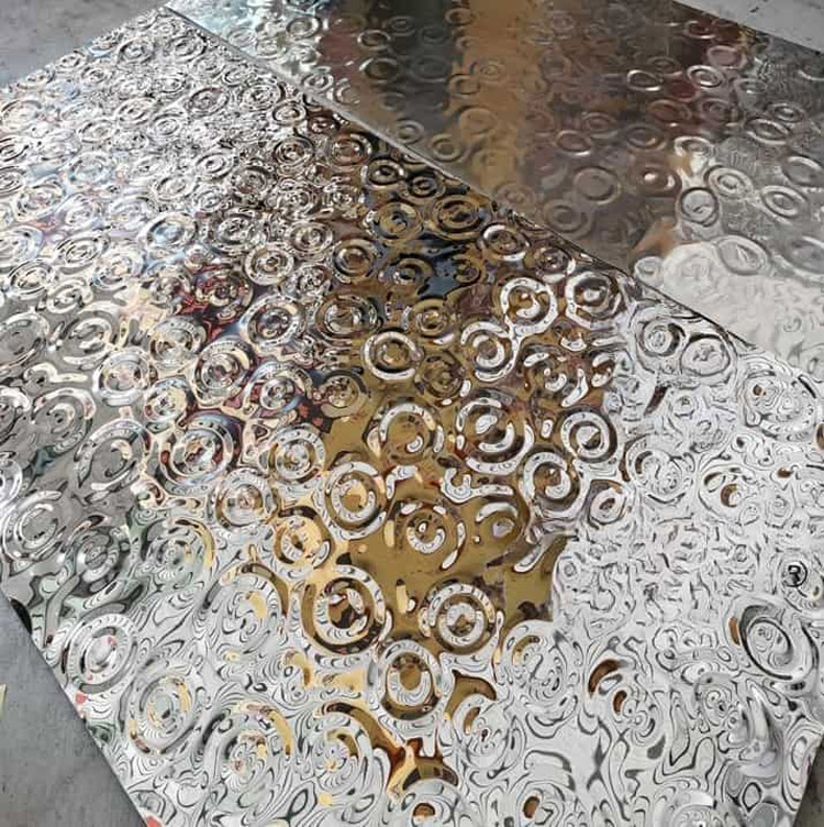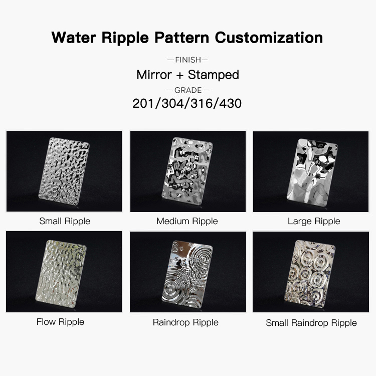 We provide stainless steel water ripple panels with ripple pattern customization service, the ripple pattern design including: small ripple, medium ripple, large ripple, flow ripple, raindrop ripple, and small raindrop ripple, etc.