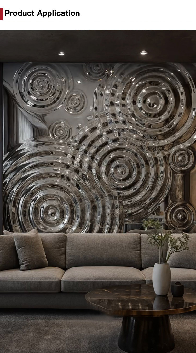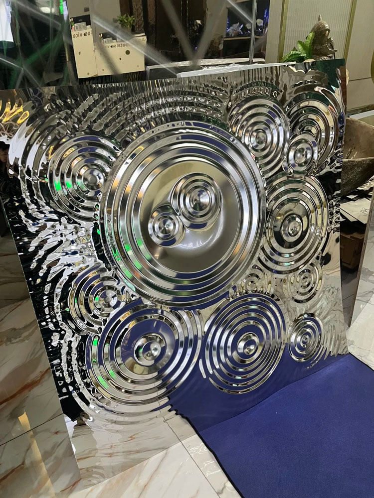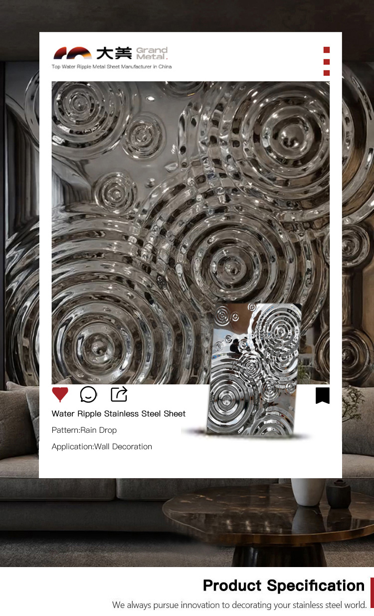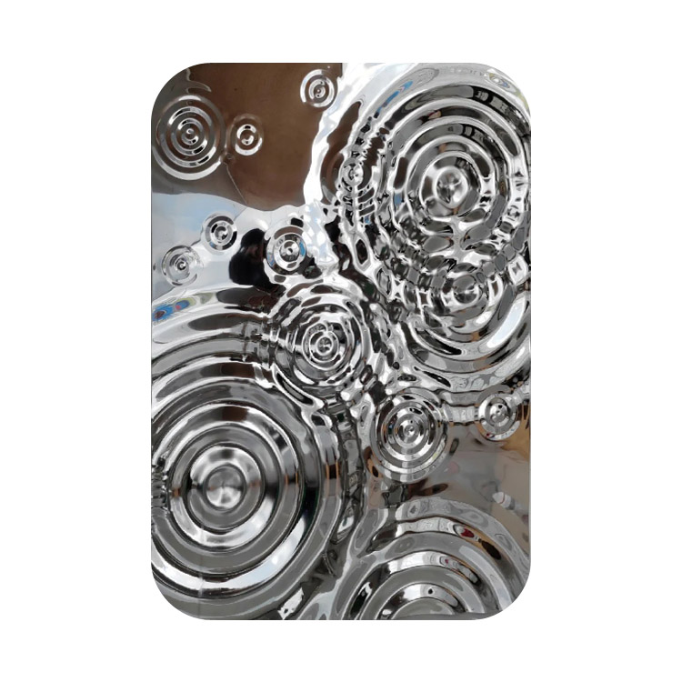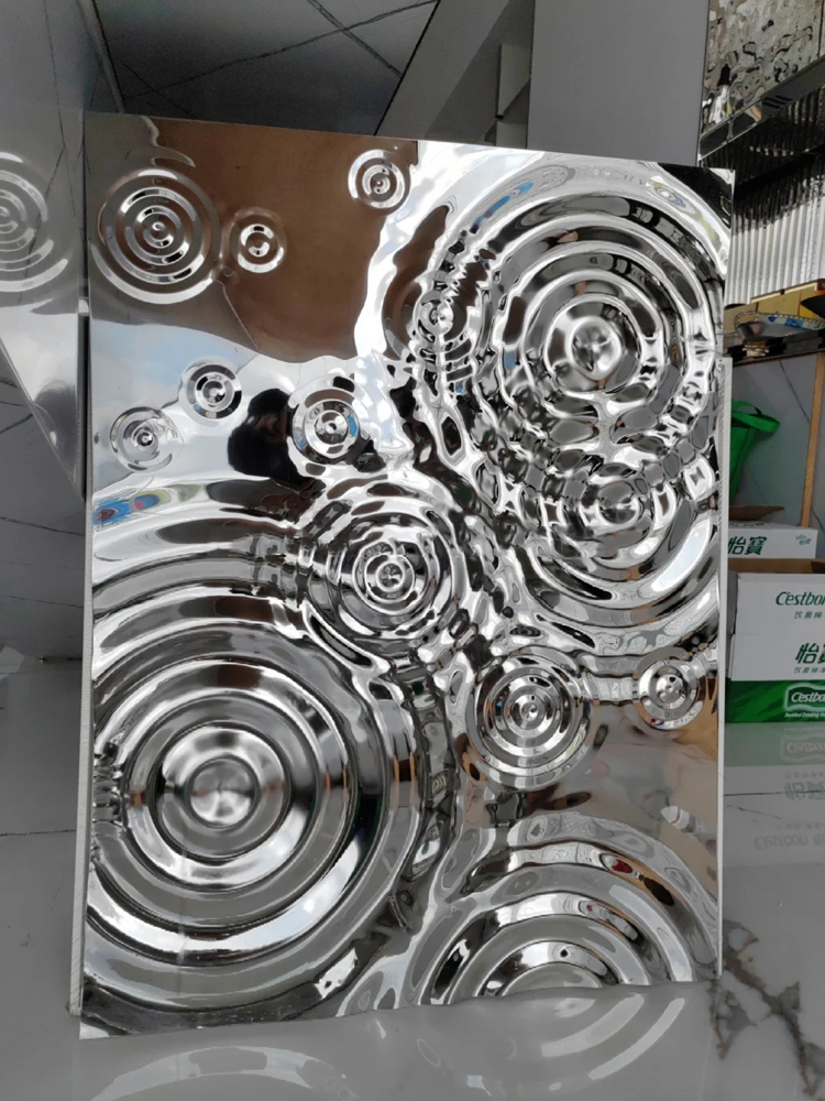 This is a mirror-finish stainless steel sheet for the wall with a raindrop ripple pattern. Its design is inspired by the irregular ripples formed when raindrops fall onto a water surface during rainfall. It uses the raindrop pattern to decorate the wall and utilizes the 3D light and shadow effects created by its mirrored surface to showcase the dynamism and depth of the wall, giving each wall a unique charm. It is an ideal wall decoration material.