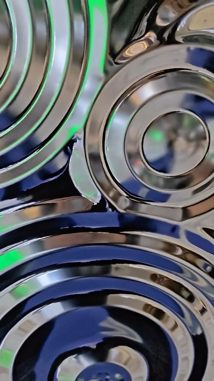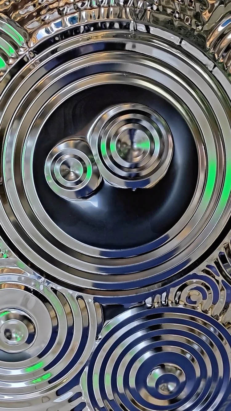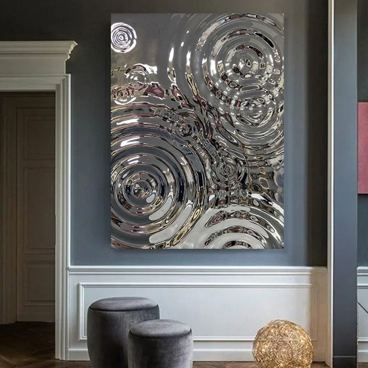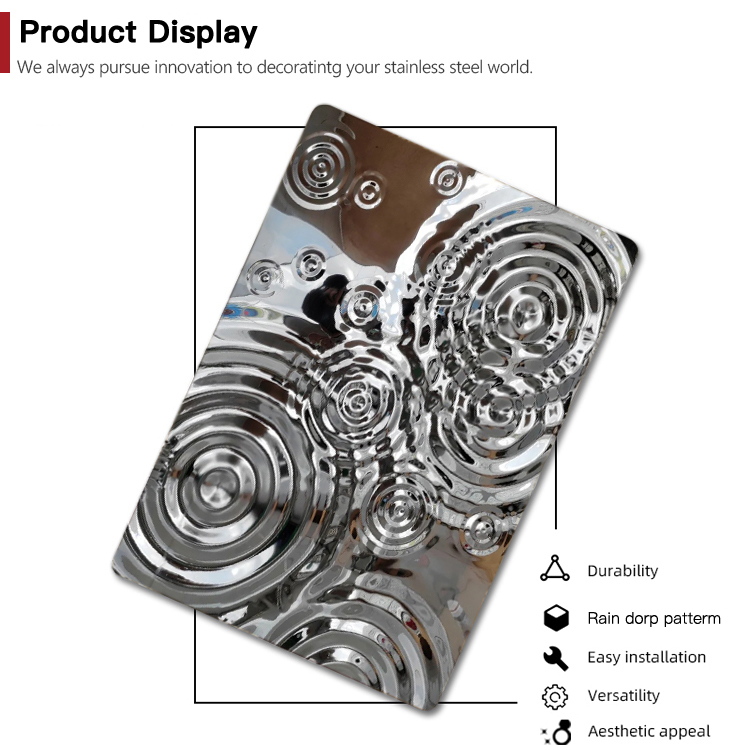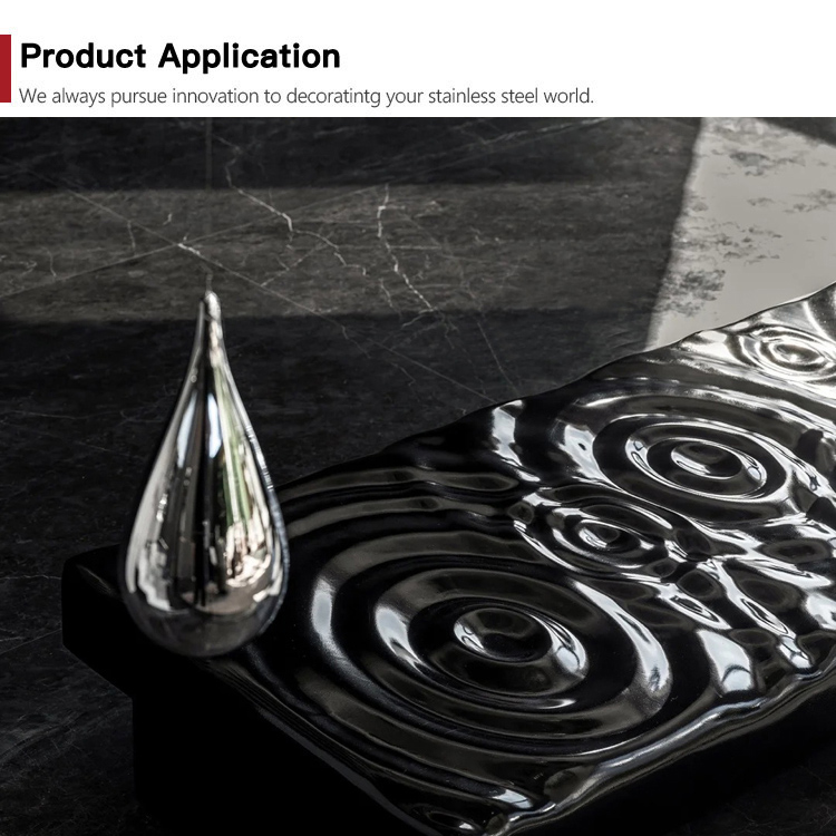 This is a mirror-finish stainless steel sheet for the wall with a raindrop ripple pattern. Its design is inspired by the irregular ripples formed when raindrops fall onto a water surface during rainfall. It uses the raindrop pattern to decorate the wall and utilizes the 3D light and shadow effects created by its mirrored surface to showcase the dynamism and depth of the wall, giving each wall a unique charm. It is an ideal wall decoration material.