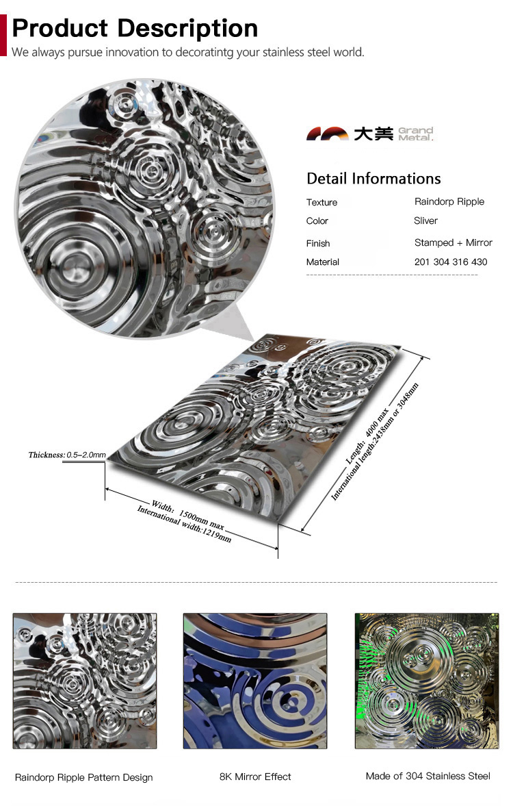 Grand 304 8K Mirror Effect Raindrop Ripple Pattern Stamped Stainless Steel Sheet for Hotel Decoration